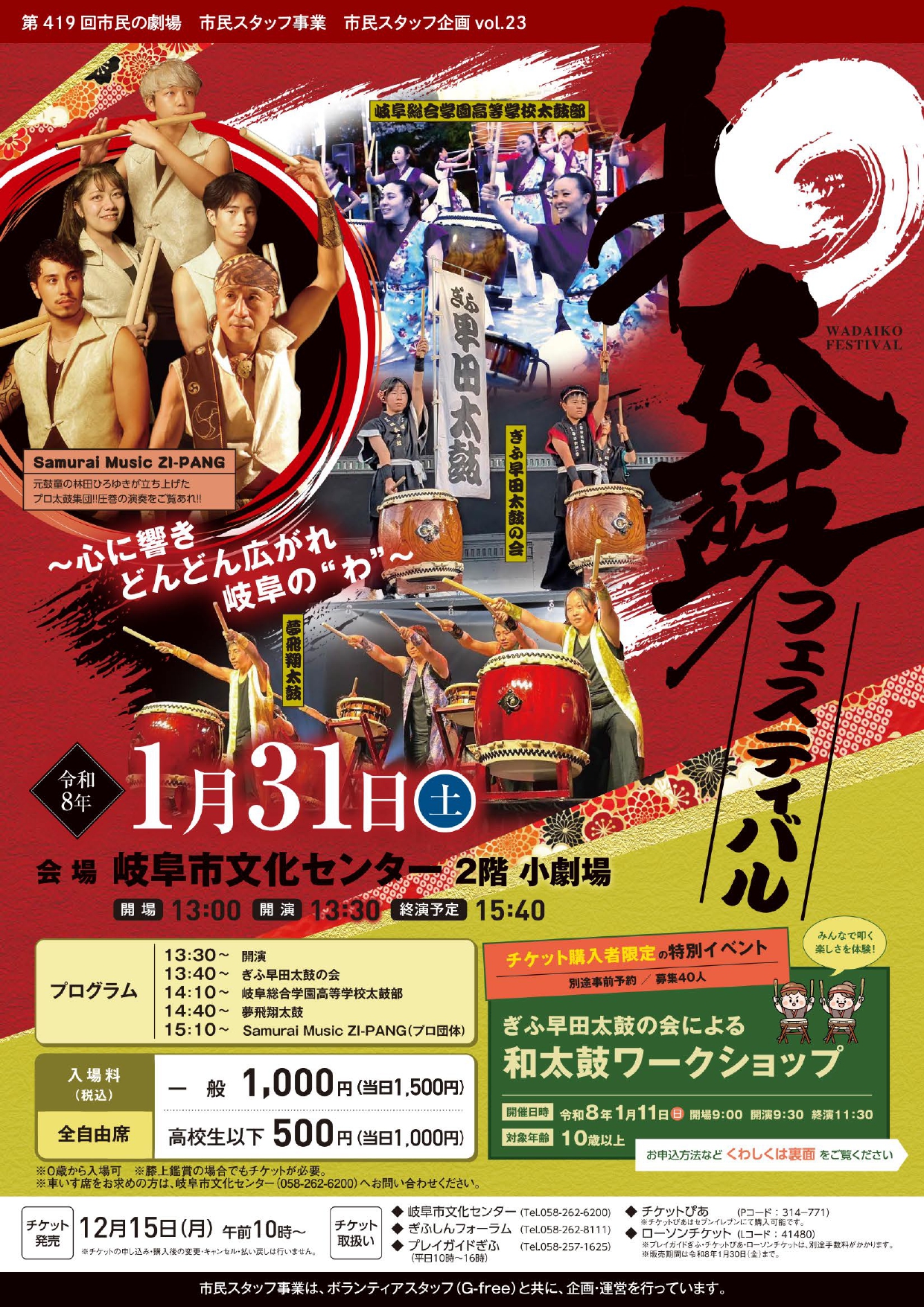 2026年1月第419回市民の劇場 市民スタッフ事業 市民スタッフ企画vol.23 『和太鼓フェスティバル~心に響き どんどん広がれ 岐阜の”わ”~』