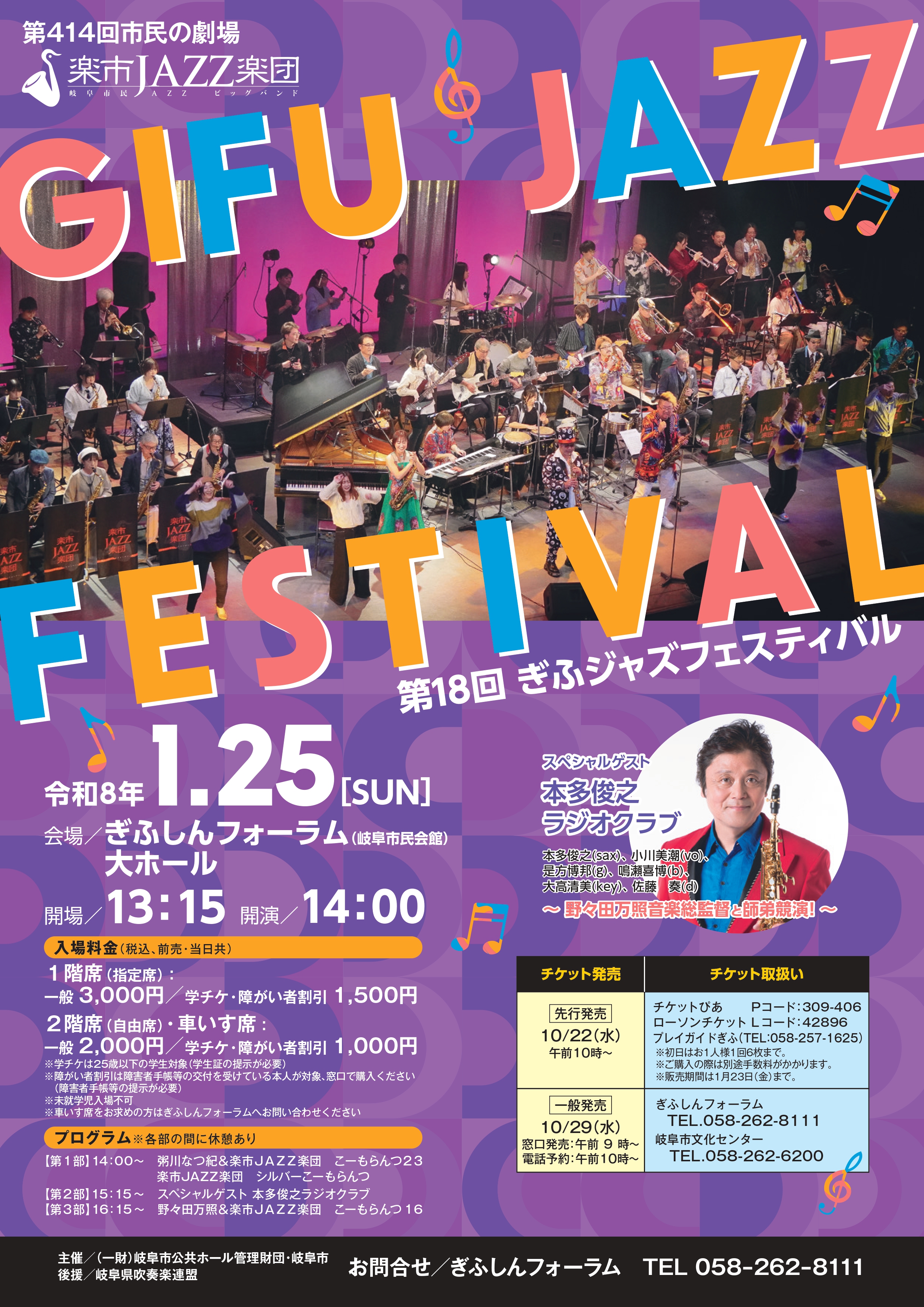 市民ジャズ・ビッグバンド「楽市JAZZ楽団」が、スペシャルゲストに野々田万照の師匠にあたる本多俊之氏率いる「本多俊之ラジオクラブ」をお迎えして第18回となるぎふジャズフェスティバルを開催します!