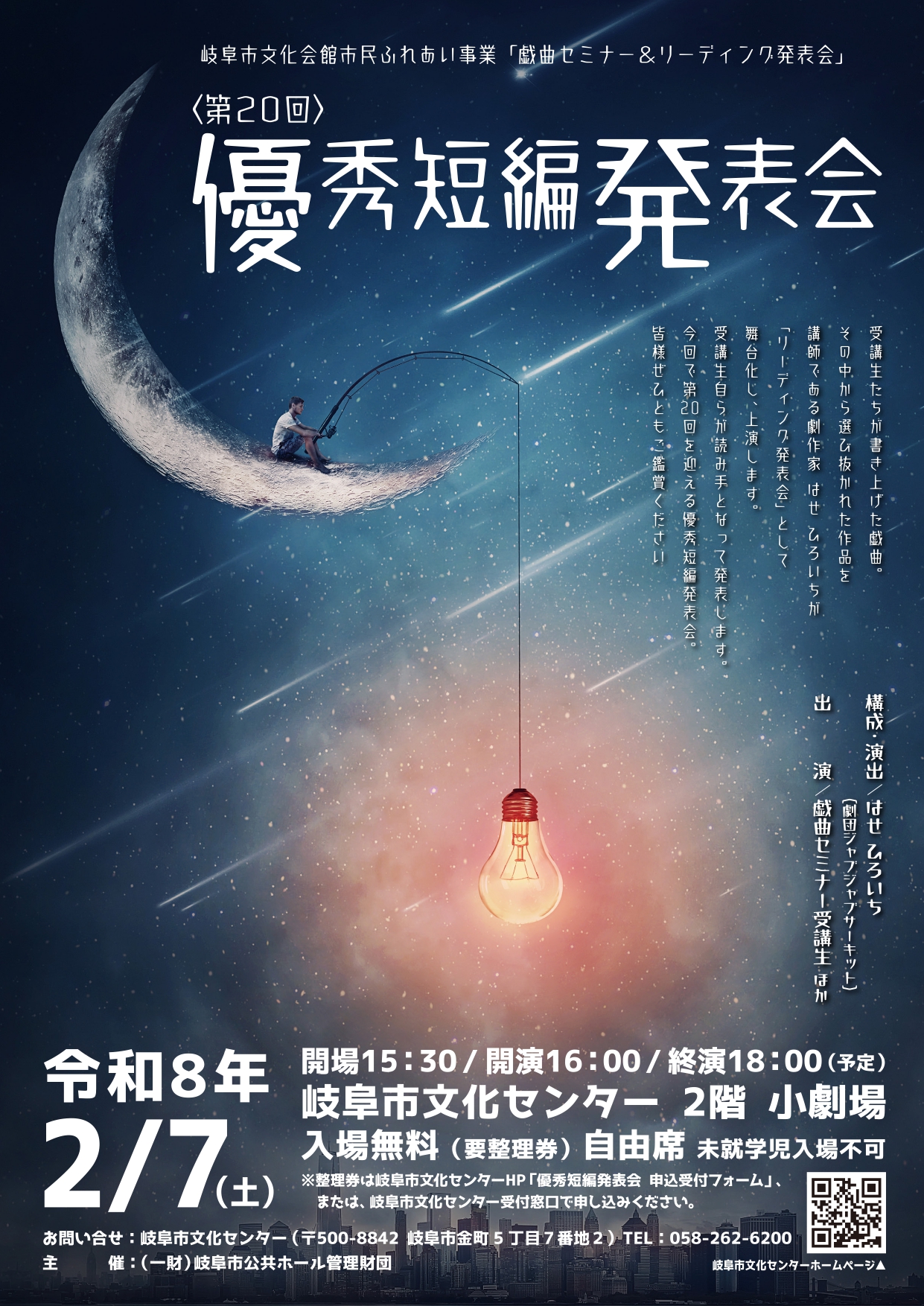 「戯曲セミナー&リーディング発表会」の受講生らが書き上げた戯曲の作品の中から、選び抜かれた作品を講師である岐阜市出身の劇作家 はせひろいち氏の構成・演出で舞台を仕上げ、受講生自らが読み手となって開催する発表会。